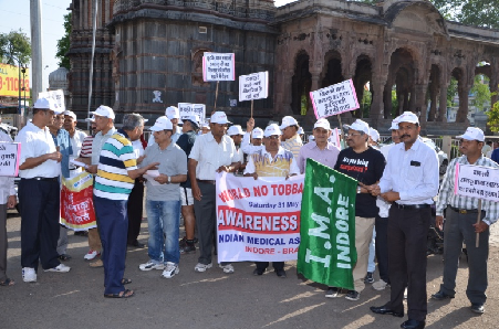 IMA MP State-Almost 17 cities in Madhya Pradesh took out public awareness rallies on WNTD, many competitions were held, lectures in school, colleges were given. IMA Indore, Dewas, Ujjain,Gwalior,Jabalpur, etc were the pioneers in the activities. IMA Indore;-“World No Tobacco Day” Rally-Flag Off By DIG Shri RakeshGupta.